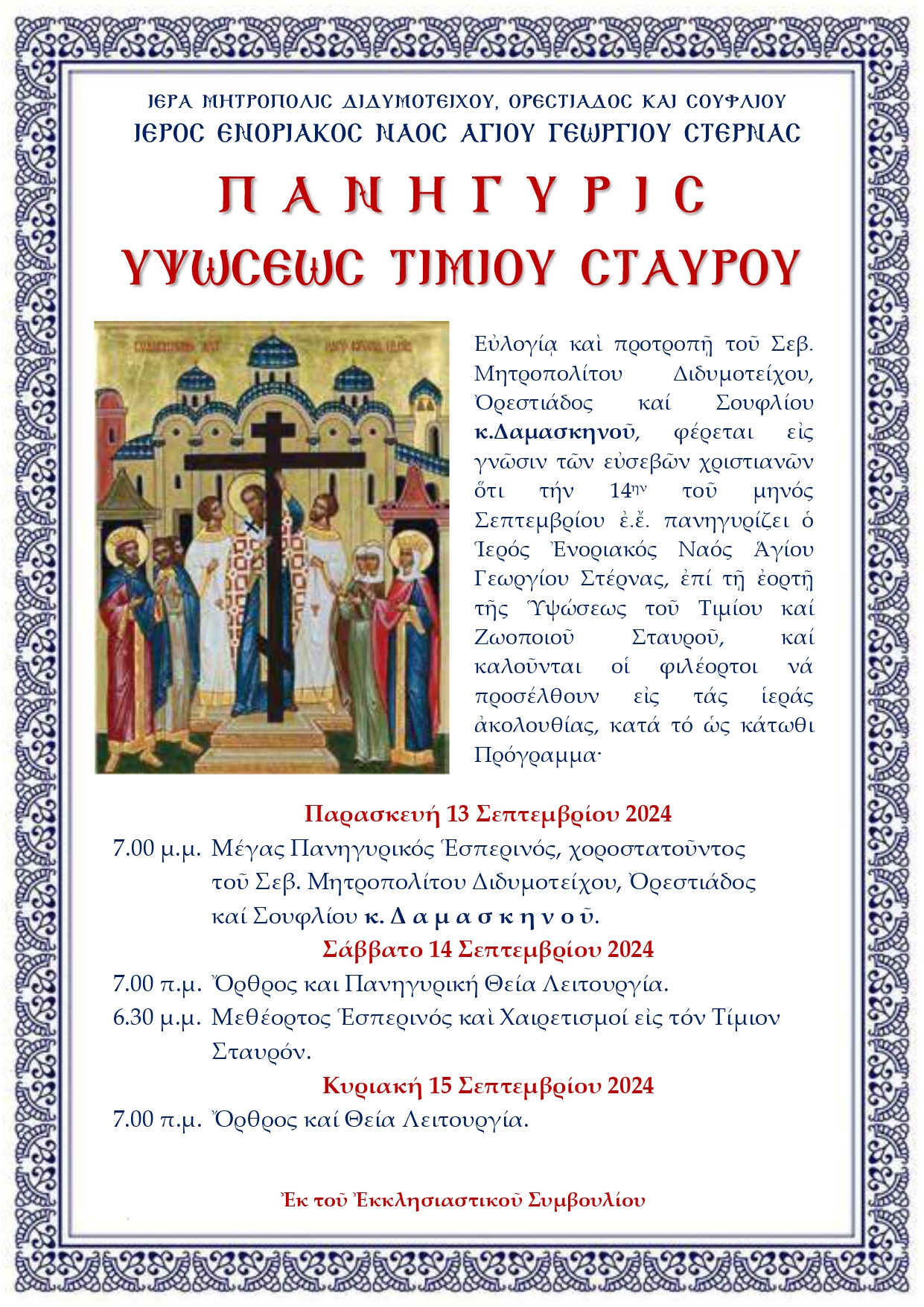 ΑΦΙΣΑ ΣΤΕΡΝΑ ΥΨΩΣΕΩΣ ΤΙΜΙΟΥ ΣΤΑΥΡΟΥ 2024 Δημοσιεύτηκε 6 Σεπτεμβρίου 2024 σε διαστάσεις 1241 × 1755 στην γκαλερί ΑΦΙΣΑ ΣΤΕΡΝΑ ΥΨΩΣΕΩΣ ΤΙΜΙΟΥ ΣΤΑΥΡΟΥ 2024