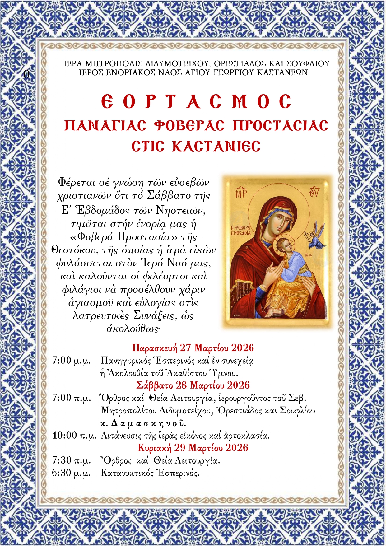 27 Ἀκαθίστου Ὕμνου· Ἐν Καστανεαῖς, ὅπου ἡ ἱερά εἰκών τῆς «Φοβερᾶς Προστασίας».