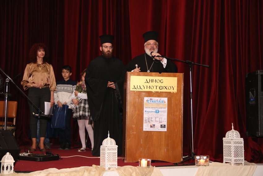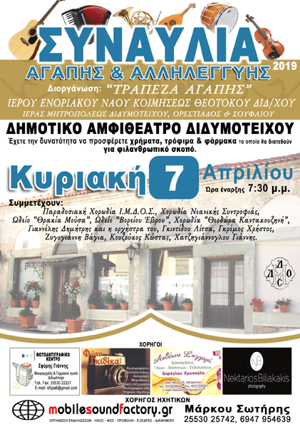 • Το απόγευμα της Κυριακής, 7ης του μηνός Απριλίου ε.ε., στο Δημοτικό Αμφιθέατρο Διδυμοτείχου, πραγματοποιήθηκε με πολλή επιτυχία, «Συναυλία αγάπης και αλληλεγγύης» με έντεχνη και παραδοσιακή μουσική για την στήριξη των κοινωνικών δομών, που λειτουργούν, προνοία του Γενικού Φιλοπτώχου Ταμείου, στο Διδυμότειχο με την υπευθυνότητα του ενετεταλμένου κληρικού Αρχιμ. Κυρίλλου Κολτσίδη, Αρχιερατικού Επιτρόπου Διδυμοτείχου. Οι θεατές και ακροατές της Συναυλίας αντί εισιτηρίου προσέφεραν φάρμακα, τρόφιμα, χρήματα και άλλα αναλώσιμα είδη.