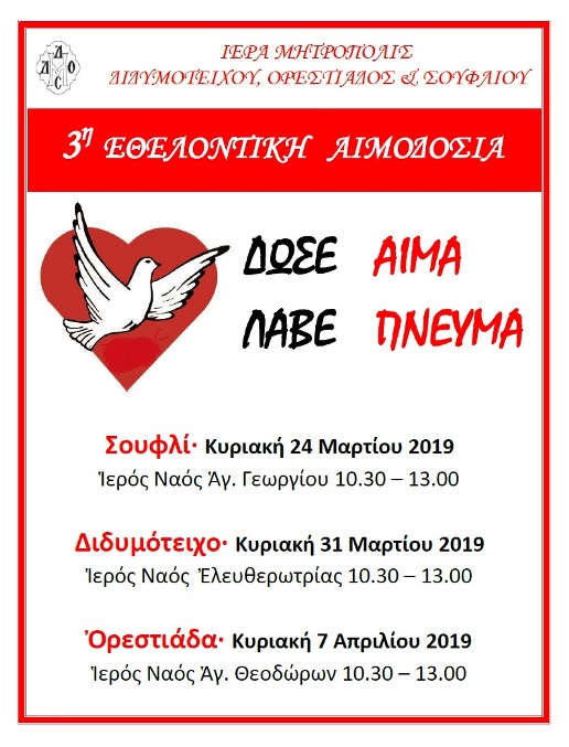 • Την Κυριακή, 7 του μηνός Απριλίου ε.ε., ολοκληρώθηκε η Αιμοδοσία που πραγματοποιήθηκε για τρείς συνεχείς Κυριακές με πρωτοβουλία της Ιεράς Μητροπόλεως, στο Σουφλί, το Διδυμότειχο και την Ορεστιάδα αντίστοιχα, με σκοπό την κάλυψη των αυξημένων αναγκών των ασθενούντων.