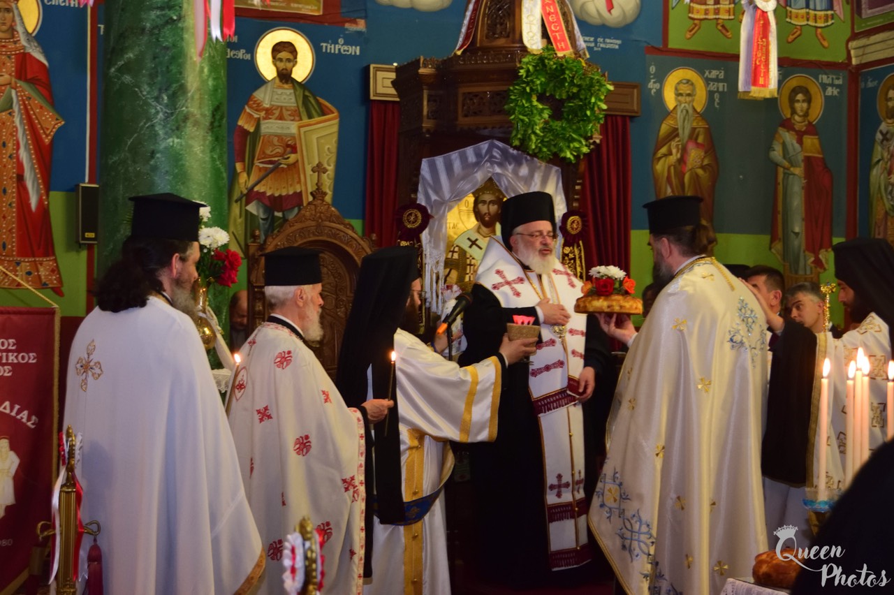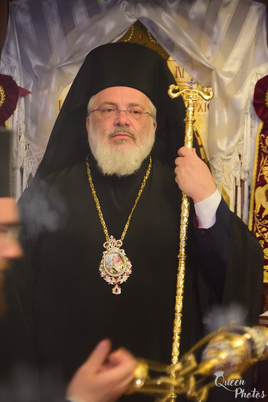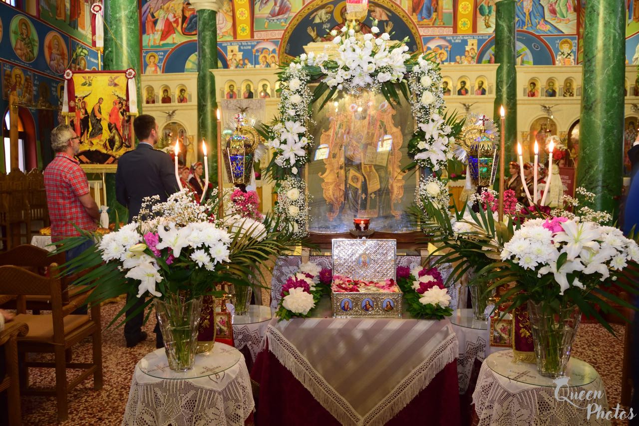 Μετά την υποδοχή των ιερών λειψάνων, που εγένετο στον αύλειο χώρο του Ιερού Ναού, ο Σεβασμιώτατος προέστη του Πανηγυρικού Εσπερινού, ευλόγησε τους άρτους και μίλησε επισημειών ότι «οι άγιοι της πίστεώς μας σήκωσαν το Σταυρό του Χριστού και είναι μάρτυρες του Αναστημένου Σώματος Του, δια τούτο και τα ιερά λείψανά τους με τη Χάρη του Θεού έχουν την ιδιαιτερότητα να μυροβλίζουν και να θαυματουργούν ή να παραμένουν άφθαρτα. Ο Χριστός ενοικεί στους αγίους, ως μέλη του Σώματός Του. Ο σκοπός της Εκκλησίας ως Σώματος Χριστού είναι να κάνει τον άνθρωπο άγιο. Με τα μυστήρια και την ασκητική της αγωγή οδηγεί τον άνθρωπο στην θέωση και τον αγιασμό. Η Εκκλησία είναι εργαστήρι αγιότητος».