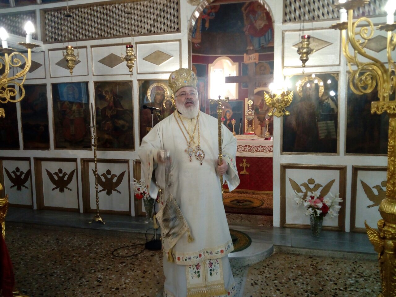 Ο Σεβασμιώτατος αναλύοντας το αποστολικό ανάγνωσμα της ημέρας, εκ της προς Εφεσίους Επιστολής του Αποστόλου Παύλου, είπε για τους αιρετικούς· «ότι οι πλανεμένοι «χριστιανοί», έχουν ως σκοπό όχι να οδηγούν στον Χριστό, τον μόνο Σωτήρα του κόσμου, αλλά να δημιουργούν οπαδούς και θύματά τους. Τί τραγική κατάσταση αλήθεια! Να πιστεύεις ότι μπορείς να γίνεις καθοδηγητής των ανθρώπων, σαν να μην υφίσταται σε σένα η αμαρτία, σαν να μην έχει έρθει η αλήθεια στον κόσμο, ο Χριστός, σαν να μην υπάρχει το Σώμα του Χριστού, η Εκκλησία. Αλλά η πνευματική τύφλωση που προκαλεί ο εγωισμός εκεί ακριβώς οδηγεί: στην δαιμονική υπερηφάνεια και στην παντελή έλλειψη της Χάριτος του Θεού. Η βλασφημία του Αγίου Πνεύματος σε όλο της το μεγαλείο!» και στη συνέχεια μίλησε για την υπευθυνότητα των ποιμένων και γενικότερα των πιστών· «ενώπιον της τραγικότητας αυτής ο απόστολος δίδει την σώζουσα κατεύθυνση: Οι πρεσβύτεροι, (αλλά και κατ᾽ επέκταση όλος ὁ πιστός λαός), πρέπει πρώτα από όλα να έχουν σωστή εκκλησιαστική συνείδηση: α) να υπηρετούν και να διακονούν την Εκκλησία ως όργανα του Κυρίου και του Πνεύματός Του. Οποιαδήποτε αυτονόμηση σημαίνει έκπτωση στην πλάνη και στην αίρεση. β) Έπειτα να προσέχουν τον εαυτό τους και το ποίμνιό τους. Η προσοχή για το ποίμνιο συνυπάρχει με την προσοχή του εαυτού τους. Δεν είναι δυνατόν δηλαδή ένας ποιμένας να λειτουργεί και να ασκεί το όποιο ποιμαντικό έργο του, έστω και με μεγάλη «επιτυχία», χωρίς η προτεραιότητά του να βρίσκεται στην καλλιέργεια του εαυτού του. Τόσο καλύτερα προσέχει το ποίμνιό του και προσφέρει σ’ αυτό δυνατότητες αγιασμού, όσο περισσότερο καλλιεργεί τις αρετές και προσέχει την πνευματική του ζωή. γ) Κι ακόμη: η εγρήγορση, ως προσοχή του εαυτού μας και των άλλων, ενισχύεται όταν προσεγγίζουμε και διδασκόμεθα από τη ζωή των αγίων μας. Ο απόστολος δεν θα μπορούσε να ήταν περισσότερο σαφής: «γρηγορείτε», λέει, «μνημονεύοντες ότι τριετίαν νύκτα καί ημέραν ουκ επαυσάμην μετά δακρύων νουθετών ένα έκαστον». Όσο μελετούμε την ζωή των αποστόλων και εμβαθύνουμε στην ζωή και τον λόγο των αγίων μας, τόσο αφυπνιζόμεθα πνευματικά, τόσο η λήθη πού ταλανίζει, ως «δομικό» στοιχείο την ψυχή μας, απομακρύνεται»